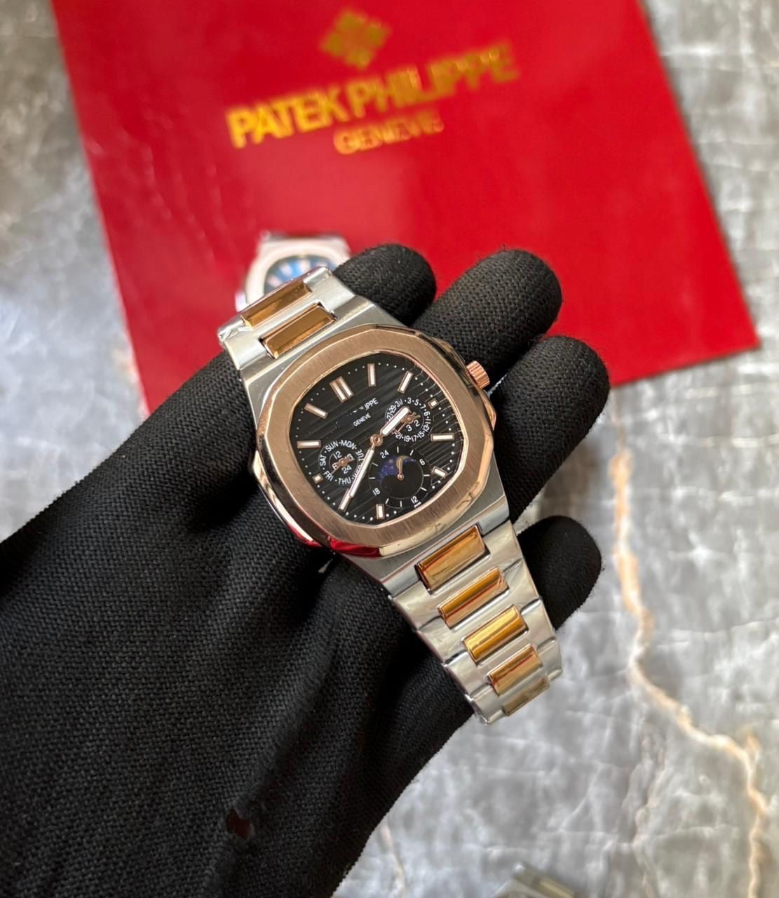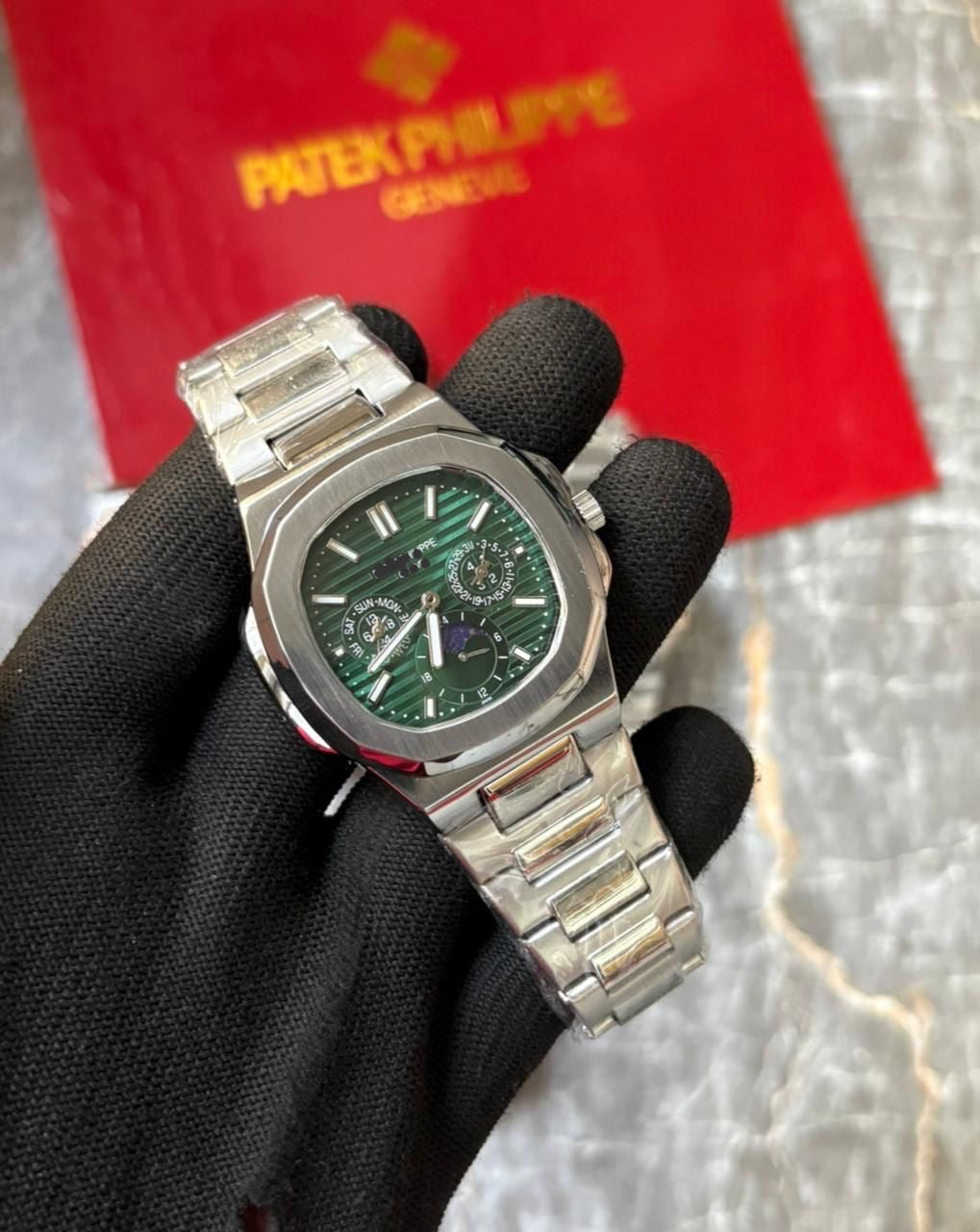 Presenting a multi-complication luxury watch with a highly recognizable octagonal bezel and integrated metal bracelet. This high-end men's timepiece features a full calendar display, including Day, Date, and Month indicators, along with an eye-catching Moon Phase display and a 24-hour sub-dial. Powered by a precise automatic mechanical movement, this watch is the ultimate statement in dress sport elegance.