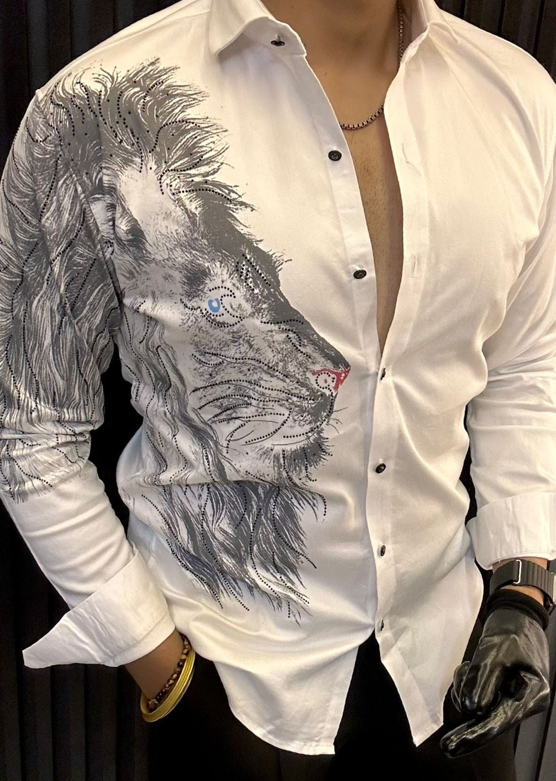 Unleash your inner confidence with this spectacular men's designer shirt. Featuring a bold, half-face lion graphic beautifully embellished with sparkling rhinestones and studs, this piece is designed to turn heads. The print extends seamlessly across the chest and sleeve, creating a high-fashion, statement look. Available in essential colors like classic black, crisp white, deep gray, and dark olive green, this slim-fit shirt offers a modern, tailored silhouette. Crafted from a comfortable, high-quality fabric, it's the perfect choice for nightclub events, parties, special occasions, or a fashionable casual look. Elevate your wardrobe with this unique, luxury button-down.