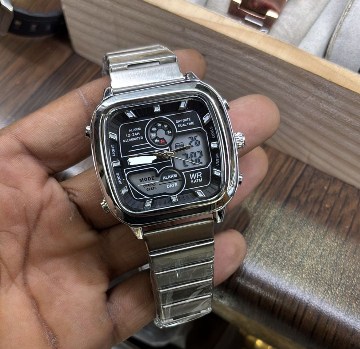 Get the iconic retro-modern look with this Square Digital-Analog Watch featuring a sleek metal bracelet in Gold or Silver. Equipped with chronograph, alarm, and day-date displays, this multi-function timepiece combines bold style with robust utility. A perfect everyday sports watch for a powerful statement.