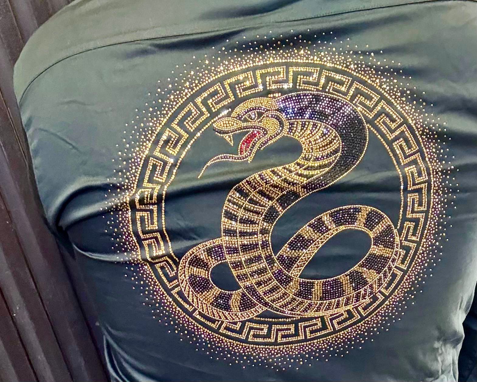 Make a legendary statement from every angle with this luxurious men's shirt. The front features an elegant, studded snake graphic on the chest, while the back boasts a spectacular, oversized rhinestone snake design encircled by a bold Greek key pattern. This unique men's shirt is crafted from a comfortable, satin-finish fabric that drapes perfectly and shimmers under the light. Available in commanding colors like jet black, deep burgundy, and crisp white, the slim-fit silhouette ensures a tailored, modern look. It's the ultimate statement piece for clubbing, concerts, parties, or any special event where you want your style to speak volumes.